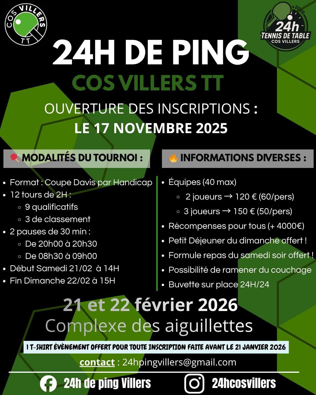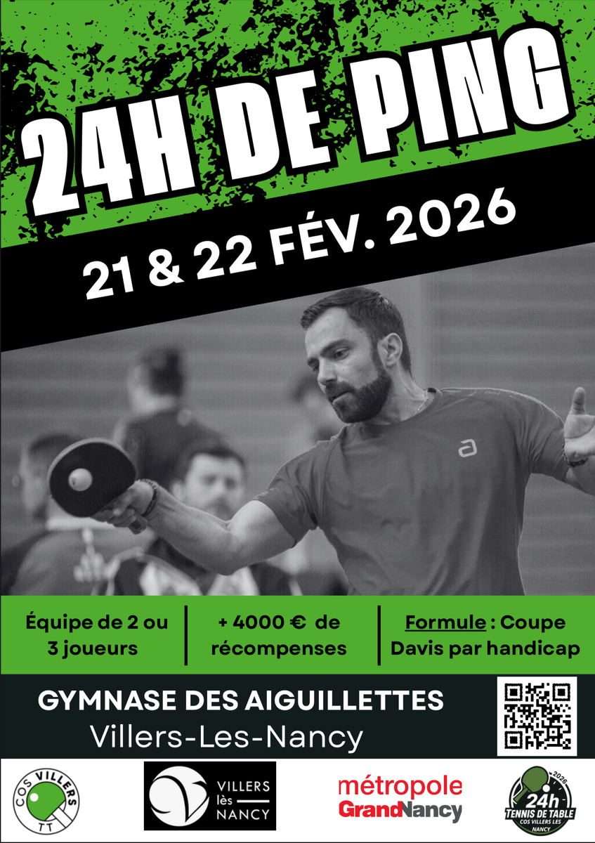 Le club de Villers organise les 24 heures de ping les 21 et 22 février 2026.